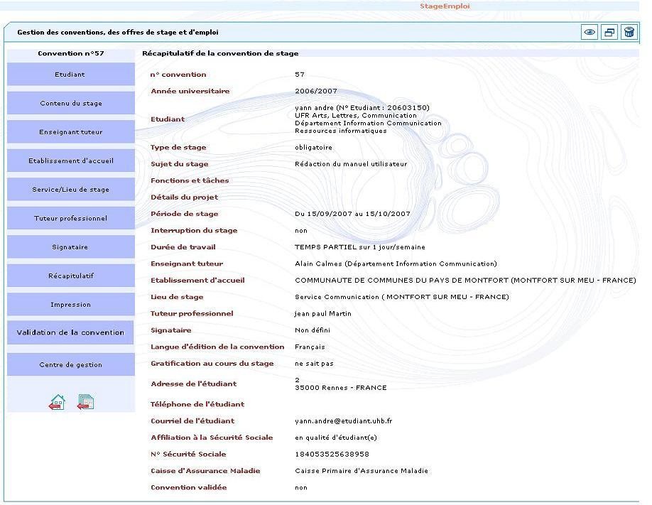 - étudiant : un étudiant peut créer et modifier une convention le concernant, visualiser ses conventions, rechercher et visualiser les établissements d'accueil, les offres de stage ou d'emploi et visualiser le centre de gestion qui gère ses conventions