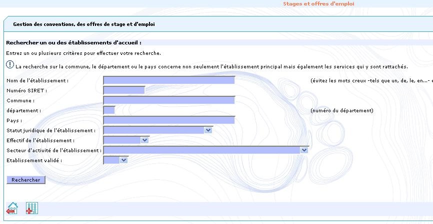 La base des établissements est mise à jour soit par les étudiants lors de la saisie d'une convention de stage soit par les personnels gestionnaires dans un centre de gestion.