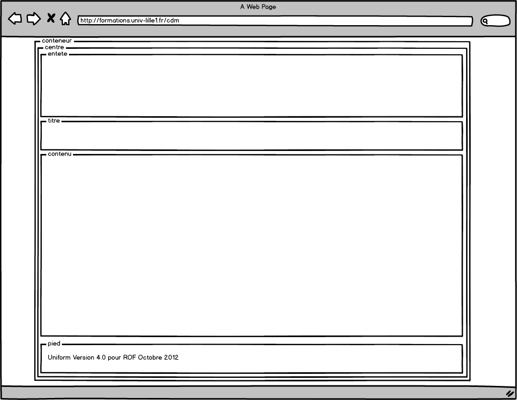 L'écran uniform est composé des div suivantes incluses dans l'élément body du html généré. L'étiquette en haut à gauche d'un rectangle représente l'identifiant de la div. La mise en forme de toutes les div sont définies dans le fichier css "stylesheets/media/main.css".