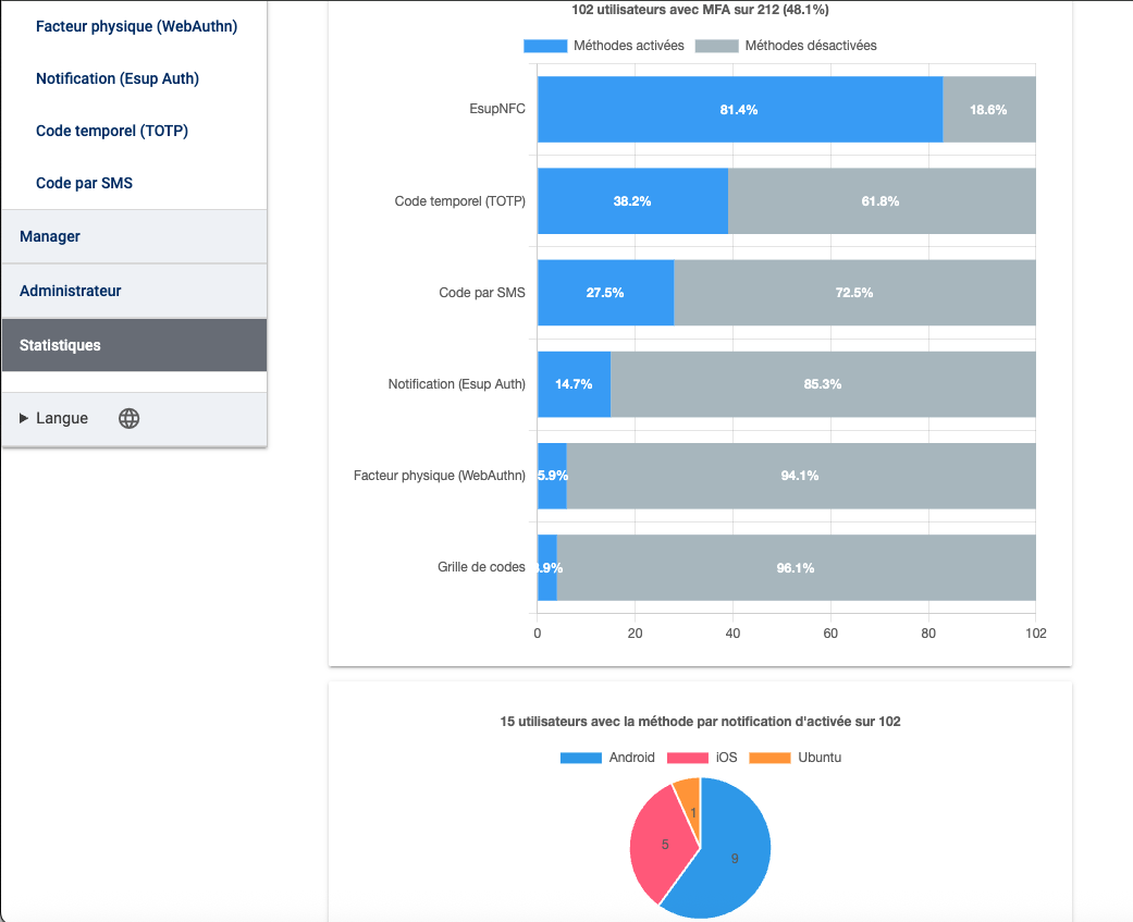 Depuis esup-otp-manager 2.0, l'administrateur dispose d'un onglet "Statistiques" qui fournit des indicateurs sur les méthodes activées par les utilisateurs.
