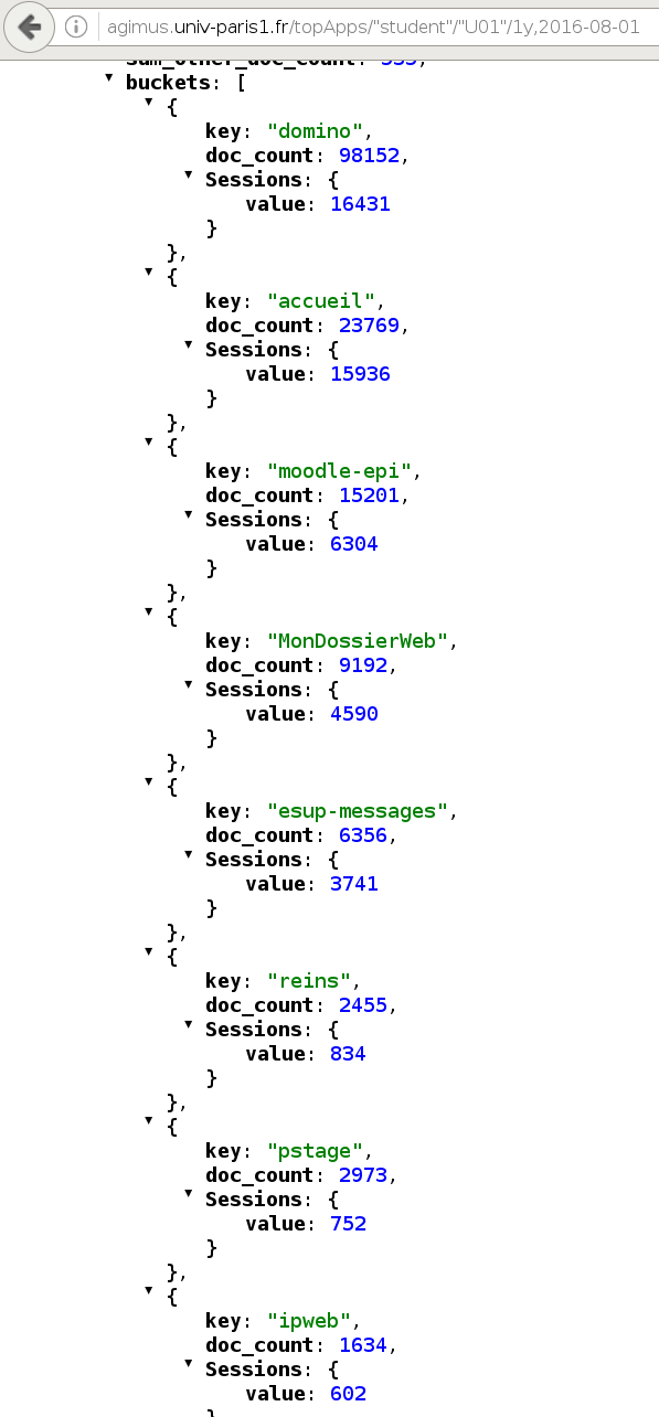 - les topApps sont renvoyés à chaque requête pour afficher la prolongationENT, la réponse doit être très rapide. Par ailleurs pour éviter que les icônes bougent nous utilisons un intervalle de requête elasticsearch qui change tous les mois : de 2015-08-01 à 2016-08-01 jusqu'au 2017-01-01 où l'intervalle devient 2016-01-01 à 2017-01-01 ...