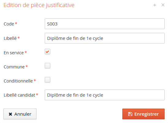 La case à cocher Commune rend la pièce justificative commune à toutes les formations du centre de candidature sélectionné.