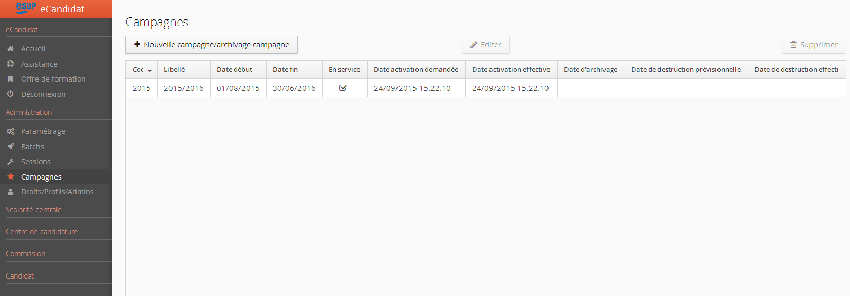 Cet écran permet de gérer les campagnes de candidatures au niveau de l’ensemble de l’application.