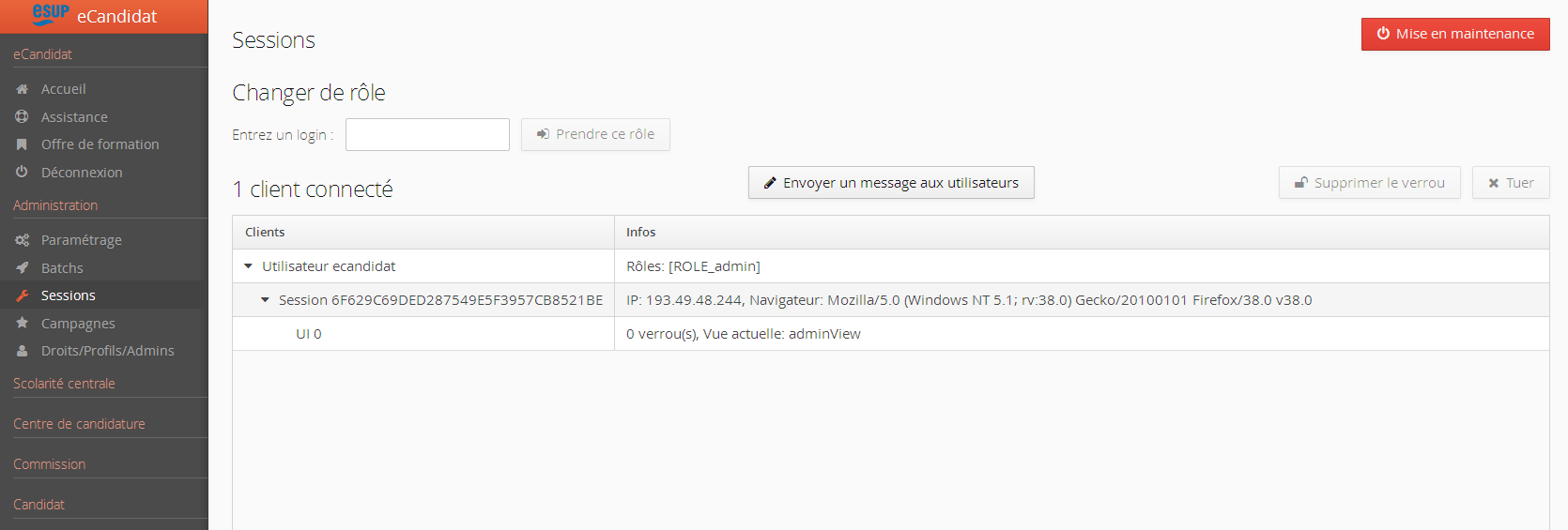 L’administrateur peut intervenir sur les sessions (blocage ou déconnexion), se substituer à un utilisateur, ou adresser un message général aux utilisateurs connectés.